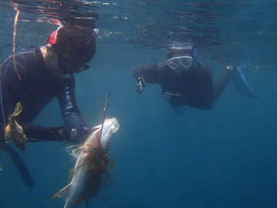 私は潜れないのでプカプカ浮いていて、魚をゲットするさまをスゲ〜とか思いながらただ見ていた。